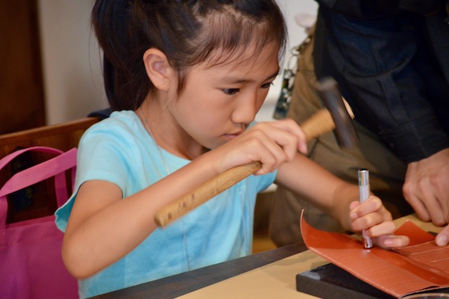 ケースの型に切ったシートを、ミシンで縫ったり、ポンチという工具で穴を空けたりしながら作っていきます。