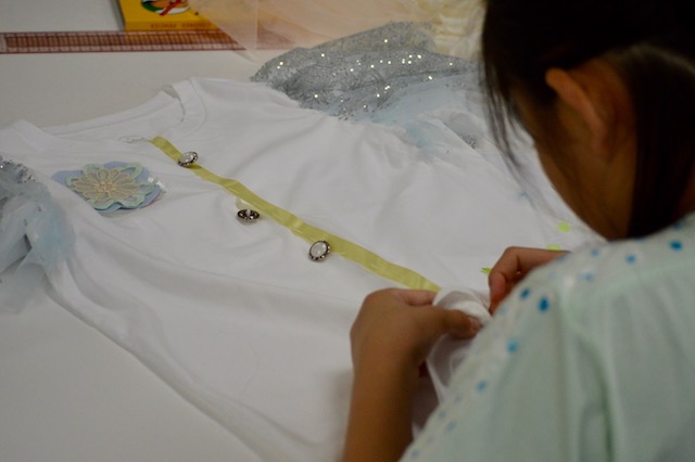 はじめてワンピースを作ってみて、肩ひもを通すところを作るところとかは難しかったけれど、やりがいがありました。デコレーションはすごく時間がかかって大変でした。デコレーションするのを選ぶところが一番楽し かったです!!!