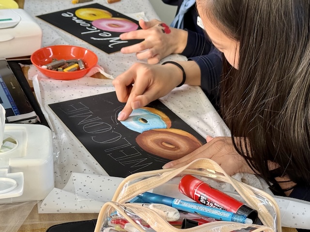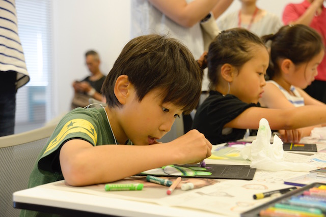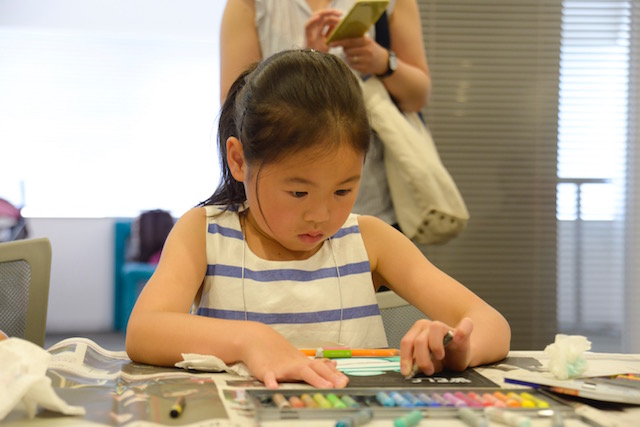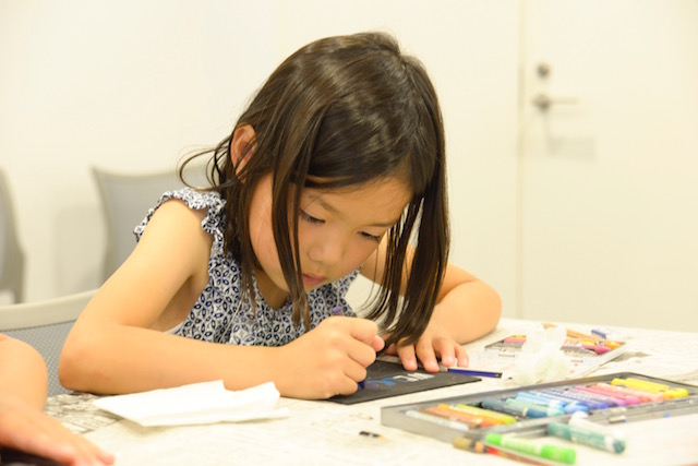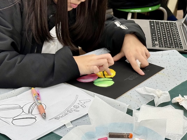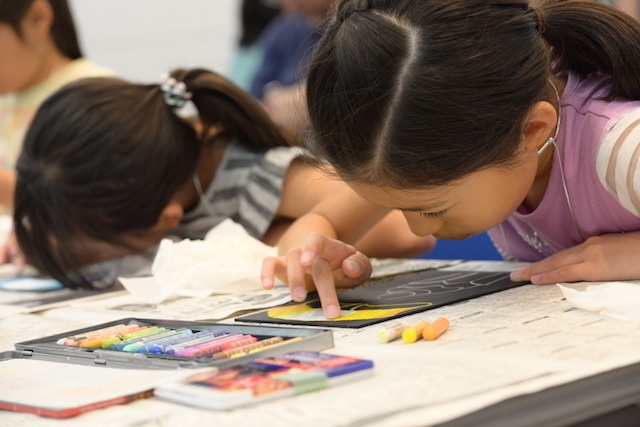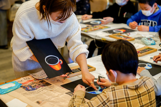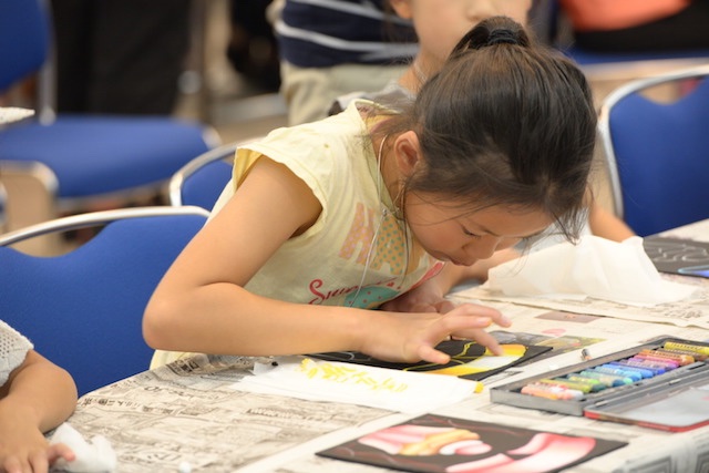私はチョークアーティストをして、光を入れるところとか、まわりに自由に絵を入れるところがおもしろかったです。あと、一つのくぎりにたくさんの色を混ぜることがびっくりしました。とっても楽しかったです!