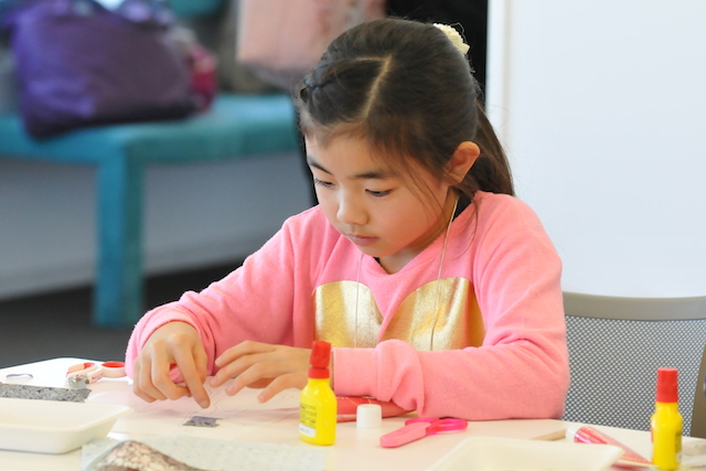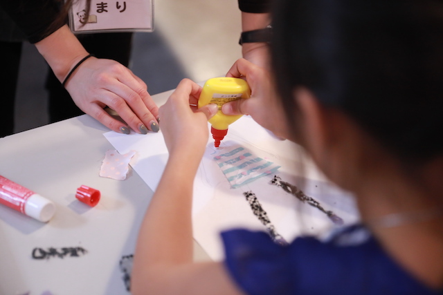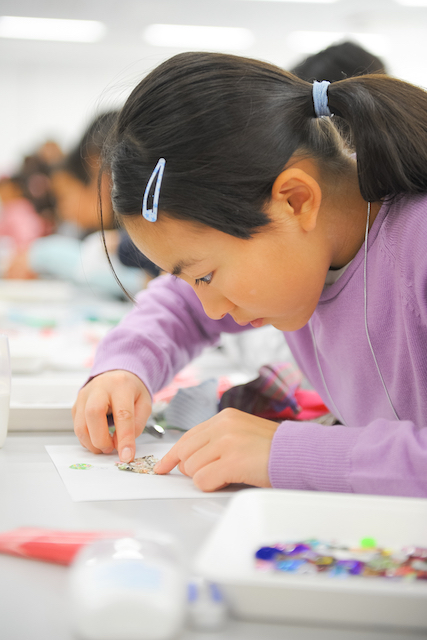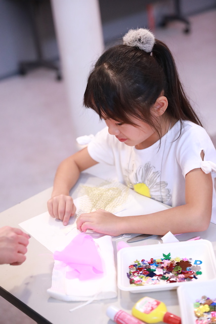いろんな布を切って貼りつけて、きらきらも貼りつけて、いろんなビーズもつけて、思いどおりのものを作れたので楽しかったです。