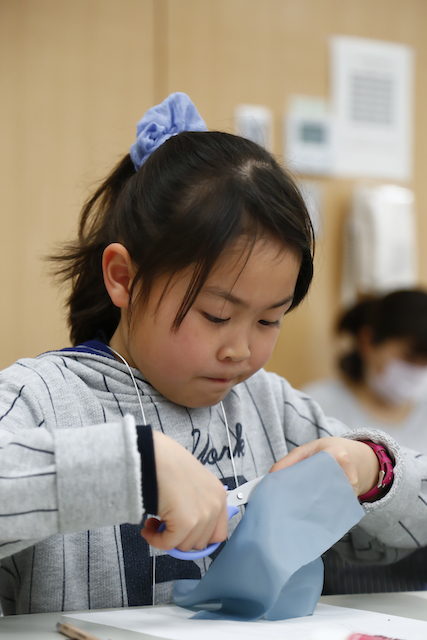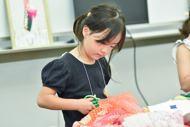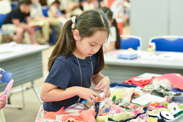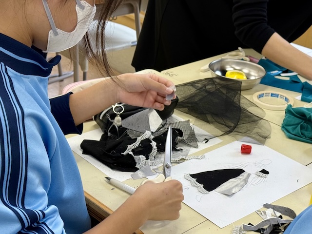 最初はどんなのを作るかわからなかったけど、作っていくうちにいろんなアイデアが浮かんでできたから楽しかった。布を使って作るのはちょっと難しかったけど、かわいい生地があって楽しかった。レースがいろいろあって思いどおりのができた。