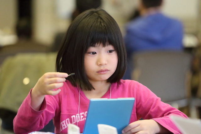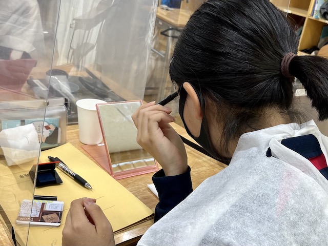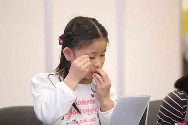 アイシャドーをつけるときに、片目を閉じてつけるのが難しかったです。チークはなかなか色がつかなかったのでたいへんでした。メイク全部難しかったけど、とても楽しかったです。