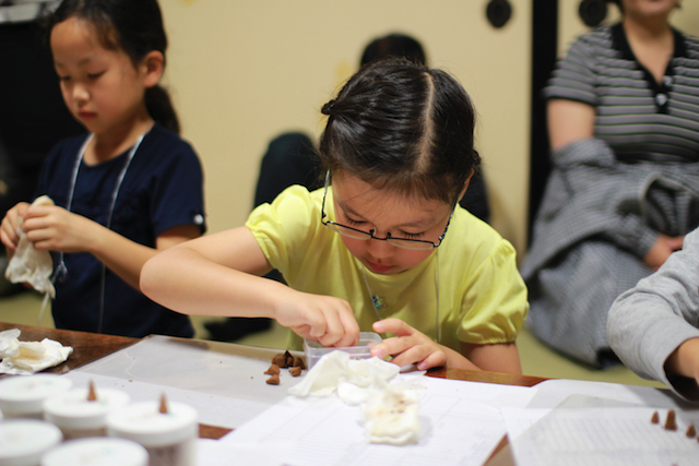 白檀はお線香の香りと似ているなぁ〜と思いました。それぞれ一つ一つ香りが違っておもしろかったです。なかにはあまり好みじゃない香りもあったけれど、他の香りと混ぜるととてもいい香りになることがわかりました。最後は心の休まる香りになりました。
